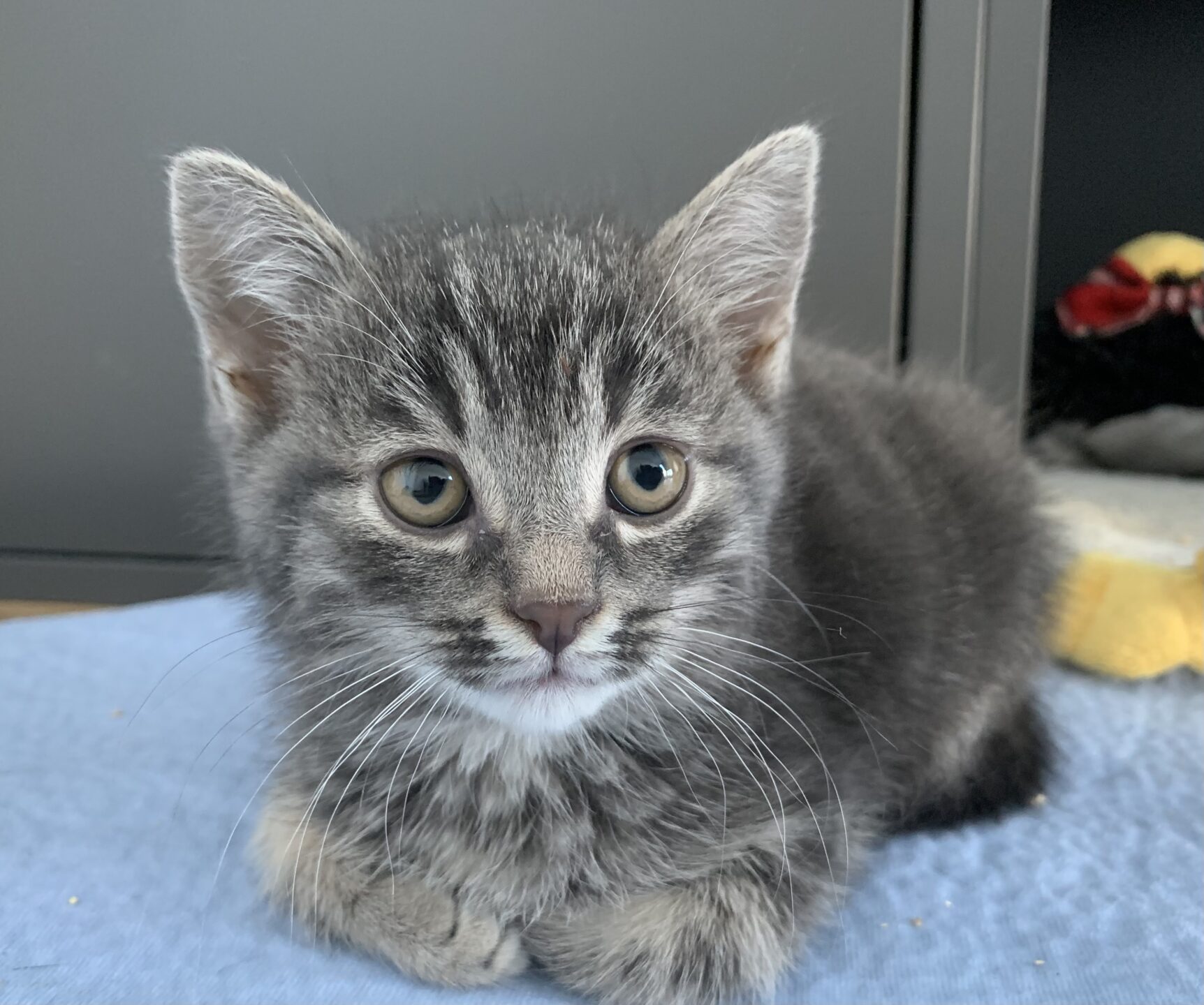 Soufflé (weiblich, grau) ist eine liebe, sanfte Katze mit viel Spielfreude und großem Kuschelbedarf.