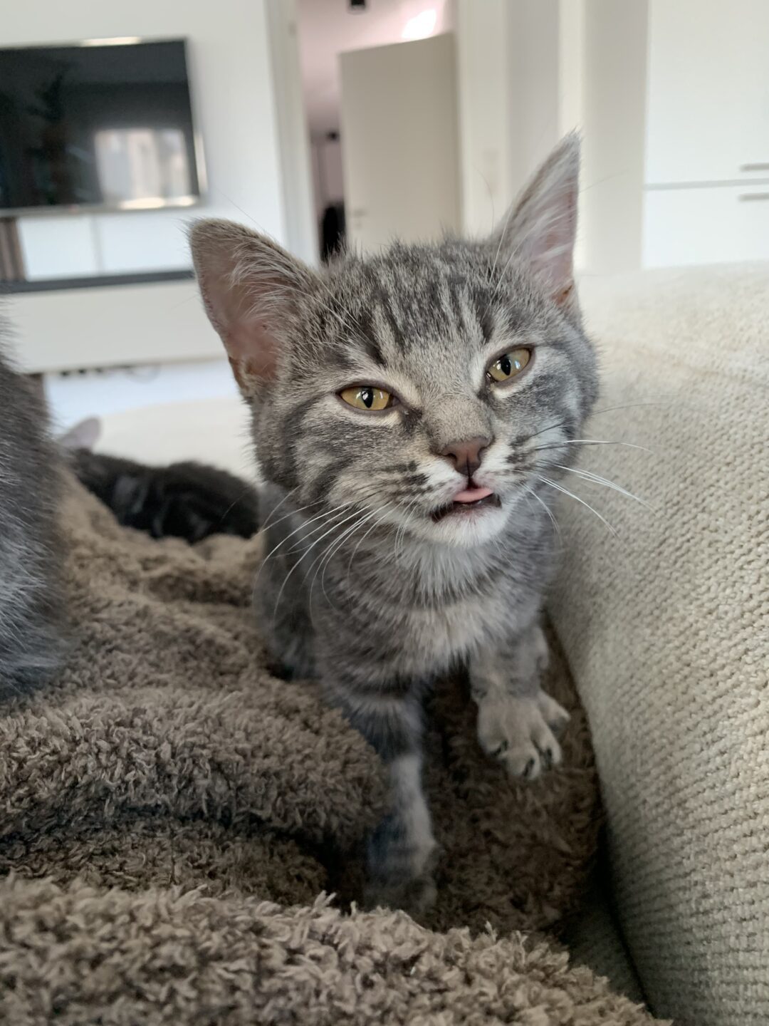 Karamell (weiblich, grau) ist noch etwas schüchtern, beobachtet aber aufmerksam ihre Umgebung und wird mit jedem Tag neugieriger. Mit Geduld und Zuwendung taut sie immer mehr auf.